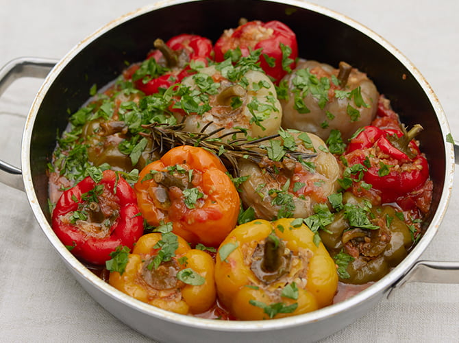 2. パプリカは、ヘタの部分を大きめに切り、種を取りのぞく。1を詰つめて、ヘタの部分で蓋をする。