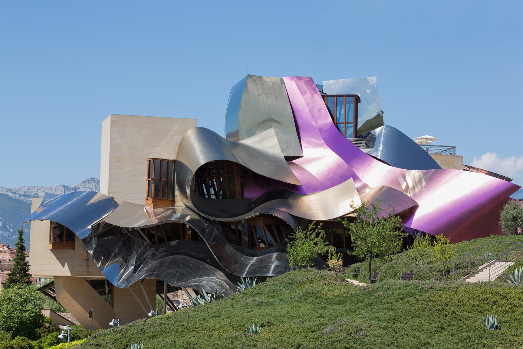 2007年竣工。設計:フランク・ゲーリー。スペイン・リオハの名門ワイナリー〈マルケス・デ・リスカル〉にアメリカ建築界を代表するフランク・ゲーリーの強烈なデザインホテルが登場。評判になったのは当然である。バイオモルフィックデザインを掲げるゲーリーは、造形的なカラーチタニウムで、 砂岩でできた矩形の建物を覆ってしまった。カラフルで表現主義的なホテルは、アバンギャルドな彫刻作品のような佇まいで来客を圧倒する。静かなワインの里に出現したワイナリーホテルは観光客を魅了してやまない。